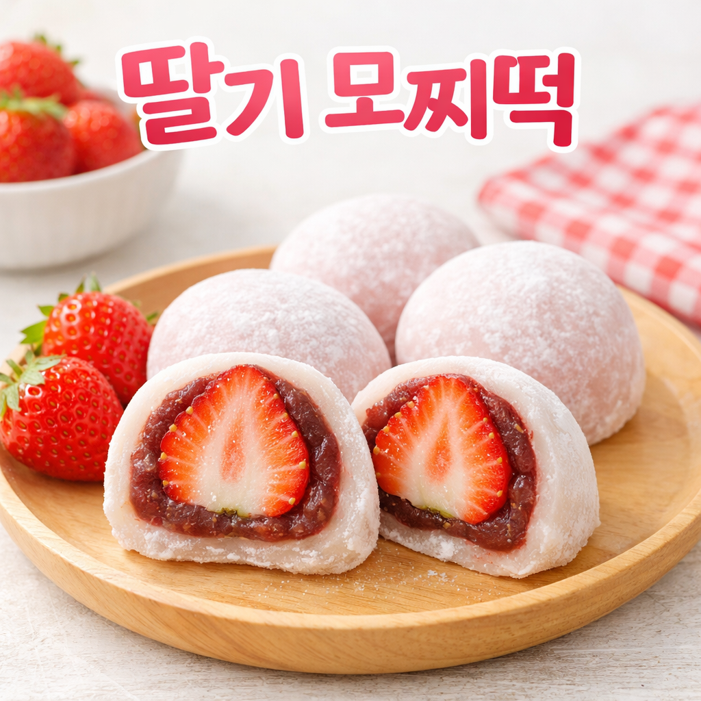 저희가 준비한 **딸기모찌떡**은 정말 특별한 상품입니다. 원래 이 제품은 올봄 시즌의 핵심 상품으로 기획되었던 인기 간식인데요, 시즈널 마케팅 계획이 변경되면서 판매 일정이 조정되었어요. 그 과정에서 신선한 상태의 재고가 남게 되었답니다. 품질이나 맛에는 전혀 문제가 없어요 - 오히려 신선함이 최고조인 지금이 먹기 좋은 타이밍이에요!